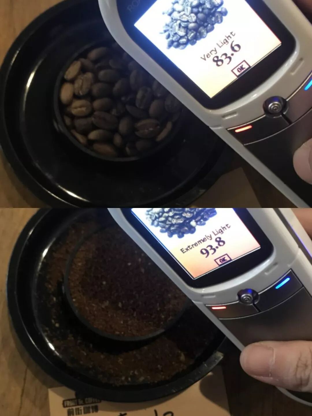 Agtron bean color value is 83.6 (above), Agtron pink value is 93.8 (bottom), Roast Delta value is 10.2.