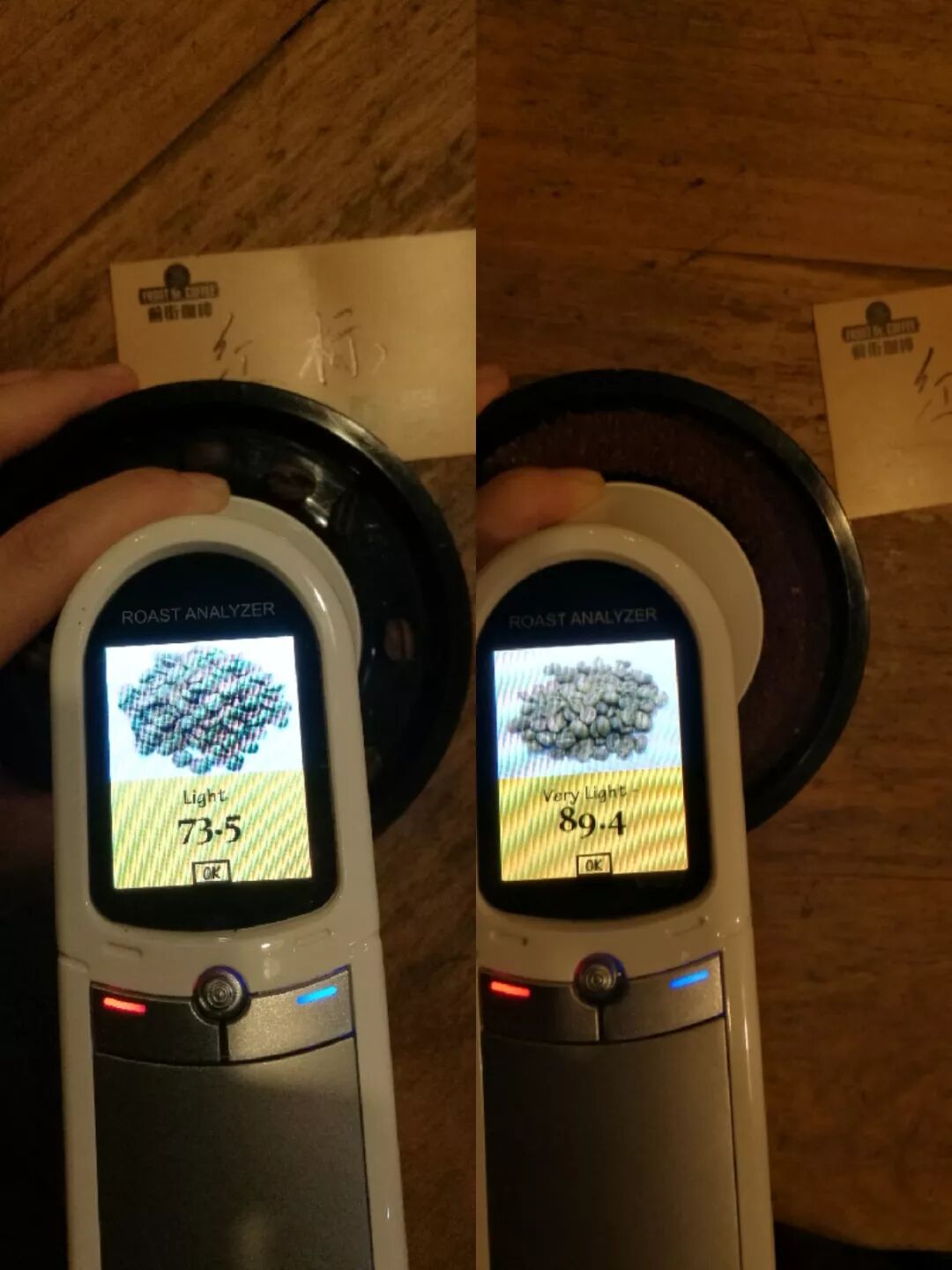 Agtron bean color value is 73.5 (left), Agtron pink value is 89.4 (right), Roast Delta value is 15.9.