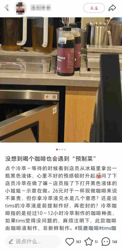 In terms of content, this customer recently bought a cup of cold extract coffee at a Tims store. While waiting to pick up the meal, he witnessed the entire process of the clerk taking out a bottle of black liquid from the refrigerator and pouring it into the cup. Therefore, he questioned the cold extract coffee produced by the store. It is a "pre-made dish" rather than freshly made.