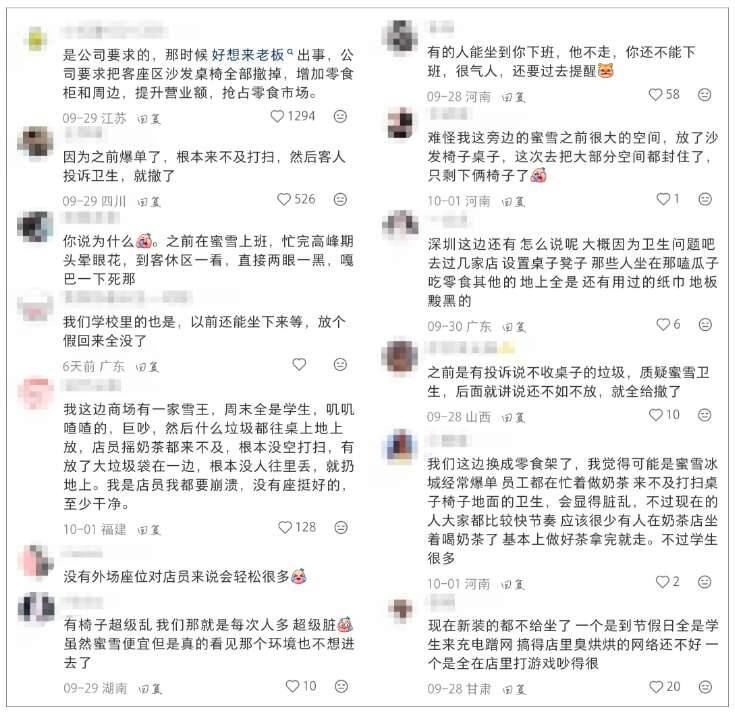 Unexpectedly, after this post was posted, netizens from other regions followed suit in the comment area and reported that the Mixue Ice City stores around them seemed to have removed the tables and chairs in the store recently."The same thing in our school used to be able to sit down and wait. After taking a vacation, it's all gone.""We have replaced it with snack racks here","Now we don't even let the newly installed ones sit on."