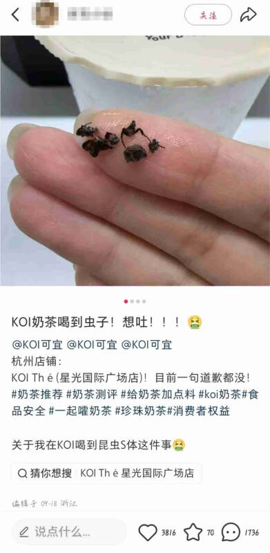 Recently, Southern Metropolis Daily and other media reported that a consumer in Hangzhou, Zhejiang Province posted feedback on social platforms, saying that he was suspected of "drinking insect corpses" in milk tea produced by the well-known freshly made tea brand KOI.