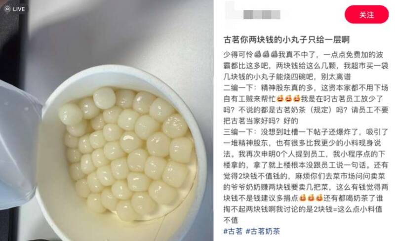 Some netizens compared Gu Ming's milk tea ingredients with those given by other tea brands such as Diandian and Coco, pointing out that after comparison, Gu Ming purchased less additional milk tea ingredients separately than its peers. Some users who love small ingredients have no choice but to admit that nowadays, in order to satisfy their appetite, if they buy Gu Ming products, they often buy two or three servings of small ingredients to be satisfied.