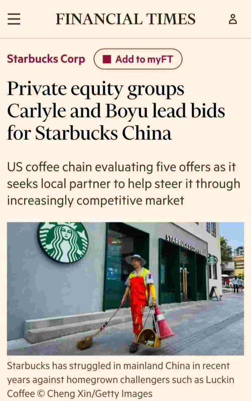 The British "Financial Times" reported that U.S. private equity giant Carlyle and China's Boyu Capital have become the main bidders for a majority stake in Starbucks's China business, and the two groups are currently regarded as Starbucks's preferred partners.