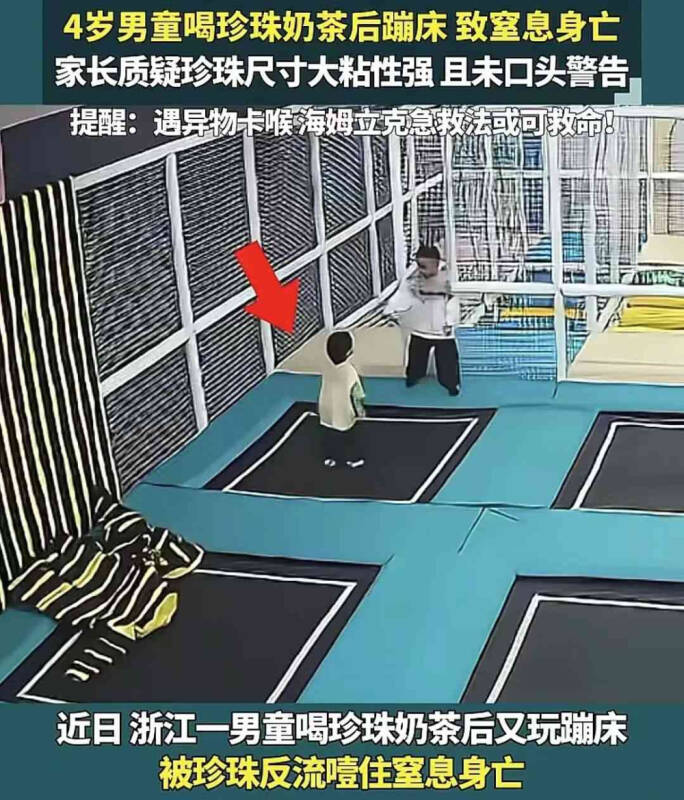 After that, the child was thirsty, so he drank pearl milk tea. After drinking it, he went to the trampoline area to play. After a while, the child's mother, reminded by other playing children, rushed to the child who was feeling unwell in about a minute and immediately gave him first aid. Then, with the assistance of the staff, she sent the child to the hospital for emergency treatment.
