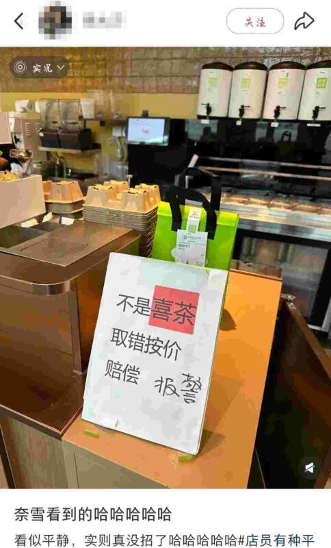 Even considering that some people who don't know the tea brand were temporarily in a trance to admit the wrong store, netizens on the scene believed that the notice placed in this store might not serve as a reminder. They pointed out that at first glance, the word "Xi Tea" marked in red and enlarged on the white paper seemed to follow up on the store's customers emphasizing that "this store is Xi Tea" and think that "the two words should be written here are Naixue and Naixue. Increase, bold and color. The label here makes people feel like it's wedding tea."