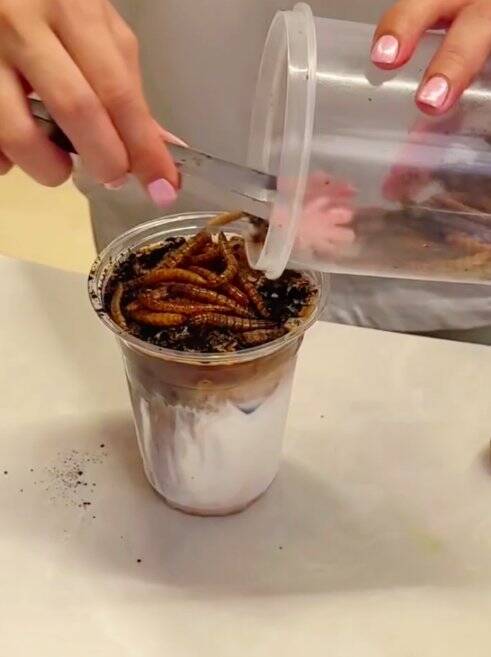 According to the graphic videos shared by netizens, the clerk would take out a number of roaches from the plastic cans, smash them into pieces, and spread them on the surface of the coffee drink together with strips of barley worms. Although cockroaches and barley worms are processed dried insects, their clear texture still brings a great visual impact to the public.
