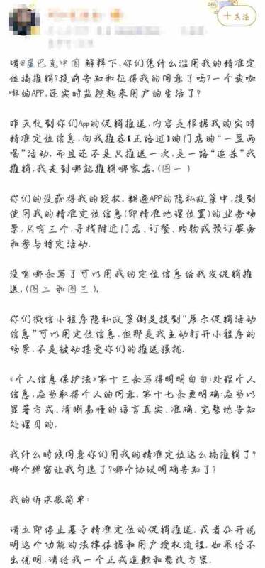 In addition, the blogger said that the privacy policy of Starbucks 'Weixin Mini Programs does mention that location information can be used to "display promotional information," but that was a scenario of actively opening Mini programs, not a passive acceptance of push harassment. The parties concerned believe that Starbucks should immediately stop promotional push based on precise positioning and publicly explain the legal basis and user authorization process for this function. If no relevant explanation is given, the user should be given a formal apology and rectification plan.