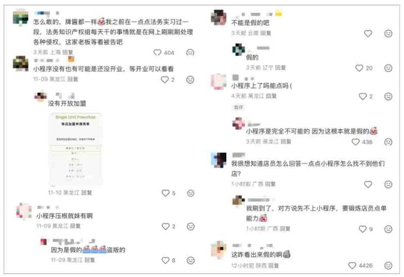 However, after the store started trial opening, netizens who went to check in found that something was wrong."There are no Mini programs at all," saying that there was no such store on the official Mini programs. At the same time, some users turned up a few official application areas for joining, pointing out that the brand has not opened up franchises in Mudanjiang City, and believed that this newly opened tea shop may not have been officially authorized.