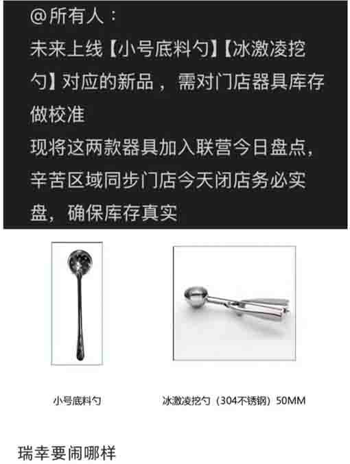 However, Ruixing workers who were busy with inventory work recently received an internal notice requiring stores to calibrate the store's equipment inventory and check whether there were small base spoons and ice cream scoops in the store.