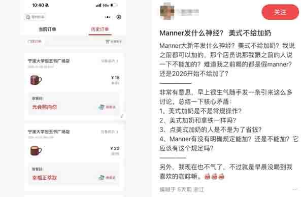 At the same time, several Manner employees who appeared in the comment area also had different opinions. Some people explained that "the headquarters training stated clearly that it can be added, and many foreigners in Shanghai want American milk mixing," bluntly speaking about the brand allowing customers to propose American milk adding practices. However, another comment stated that "Manner just stipulated that milk is not allowed," emphasizing that store management has been strict recently and migrant workers dare not do "American milk addition" that does not meet production standards.