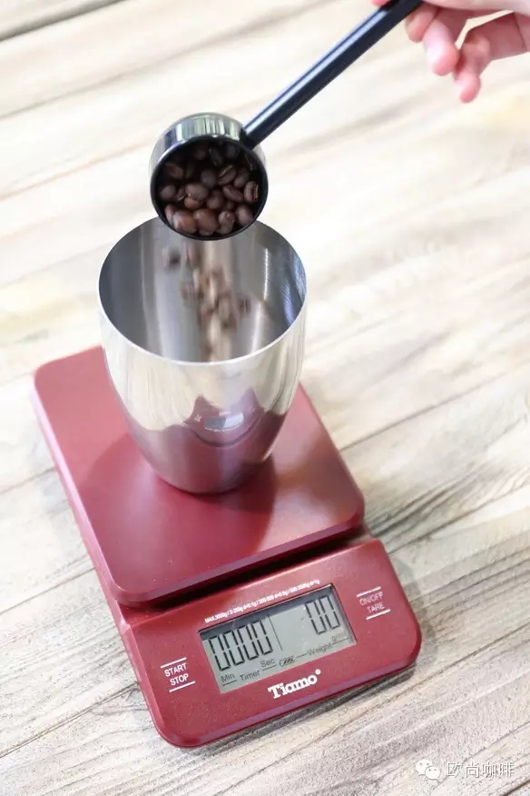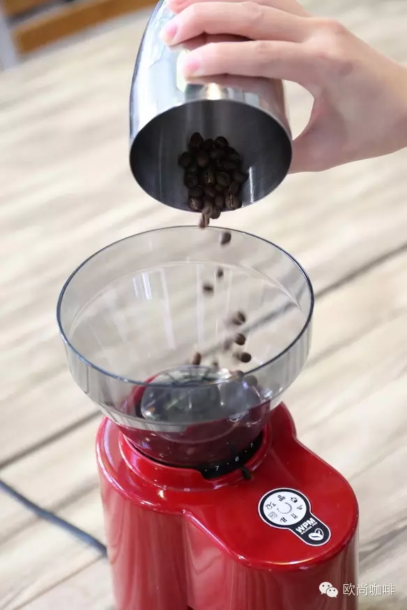 Take 40g coffee beans as spare, and then take a small amount of coffee beans to test the grinding degree of the grinder. The coffee powder is adjusted to be similar to the granulated sugar. Then grind 40g coffee beans into powder.